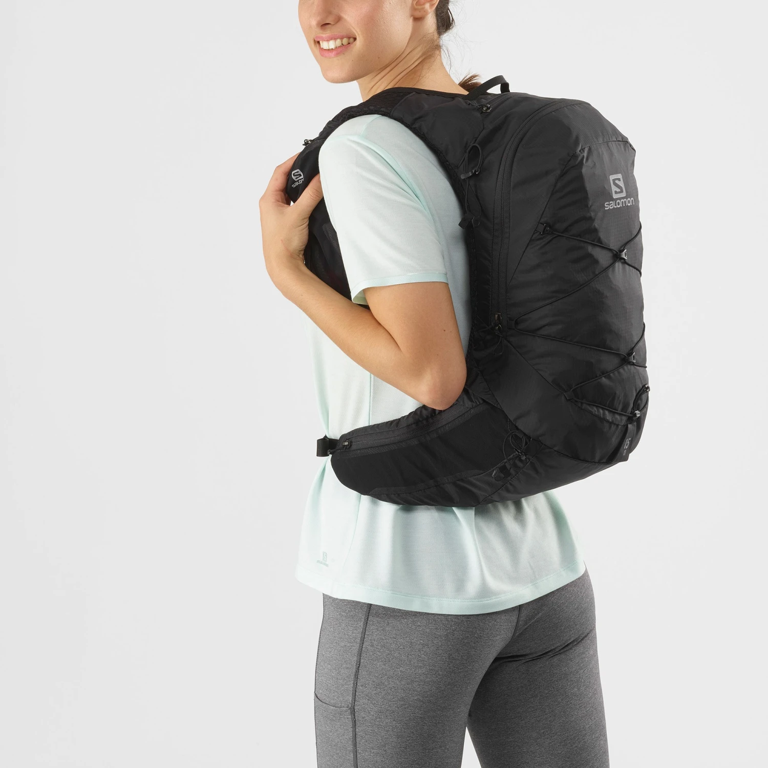 Keep comfy with soft, stretchy fabrics and a breathable back, as well as an adjustable harness system and supportive waistband to optimize the fit.